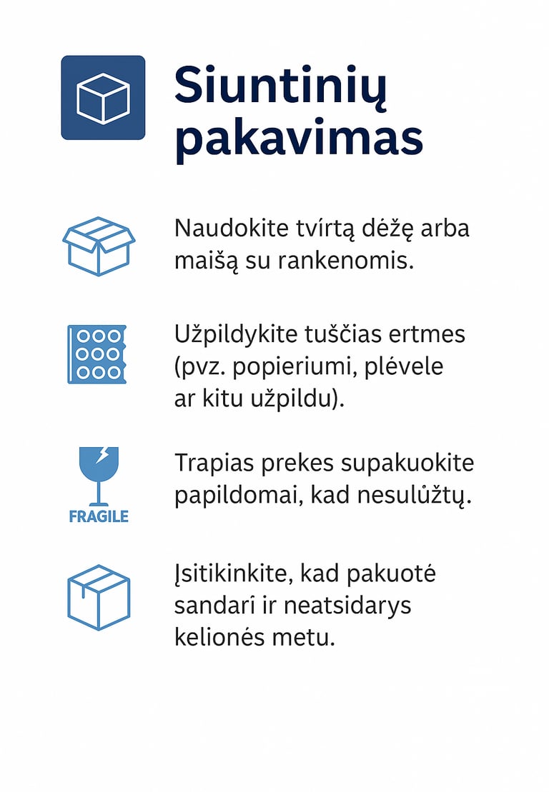 Mes turime teisę tikrinti siuntinius, jei kyla įtarimų, kad jie gali tureti draudžiamų daiktų. Už pažeidimus atsakote patys ir privalėsite padengti visas išlaidas bei nuostolius, padarytus dėl žalos. Visų daiktų, draudžiamų pagal Lietuvos ir Švedijos įstatymus, negalima dėti į siuntinį.