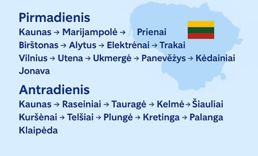 MARŠRUTAI GALI ŠIEKTIEK KISTI, PRIKLAUSOMAI NUO SIUNTŲ PAĖMIMO TAŠKŲ IR KLIENTŲ POREIKIŲ, TAČIAU VISADA ORIENTUOJAMĖS Į PATOGIAUSIĄ GREIČIAUSIĄ SURINKIMO BEI PRISTATYMO KELIĄ.